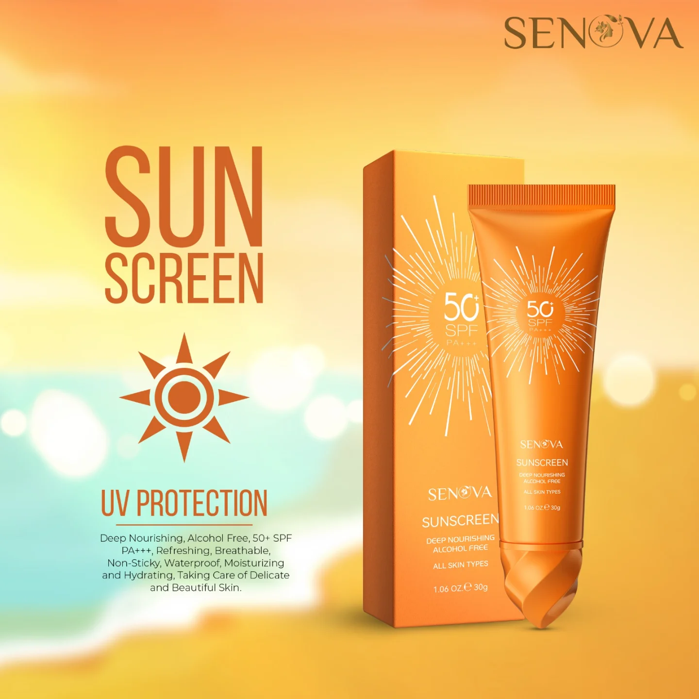 SENOVA Sunscreen SPF 50+ PA+++ is an alcohol-free, deep nourishing sunscreen designed for high protection against harmful UV rays while moisturizing and hydrating the skin.