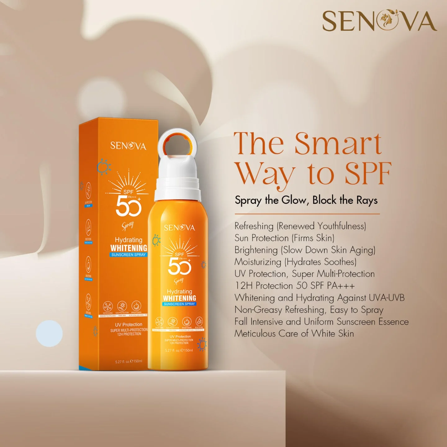 Senova Hydrating Whitening Sunscream Spray provides broad-spectrum SPF 50 PA+++ protection against harmful UV rays while delivering deep hydration. Its lightweight, non-greasy formula ensures an even application, shielding the skin from sun damage while keeping it nourished and fresh. Designed for long-lasting wear, this ultra-fine mist absorbs quickly, leaving a smooth, breathable finish without stickiness.