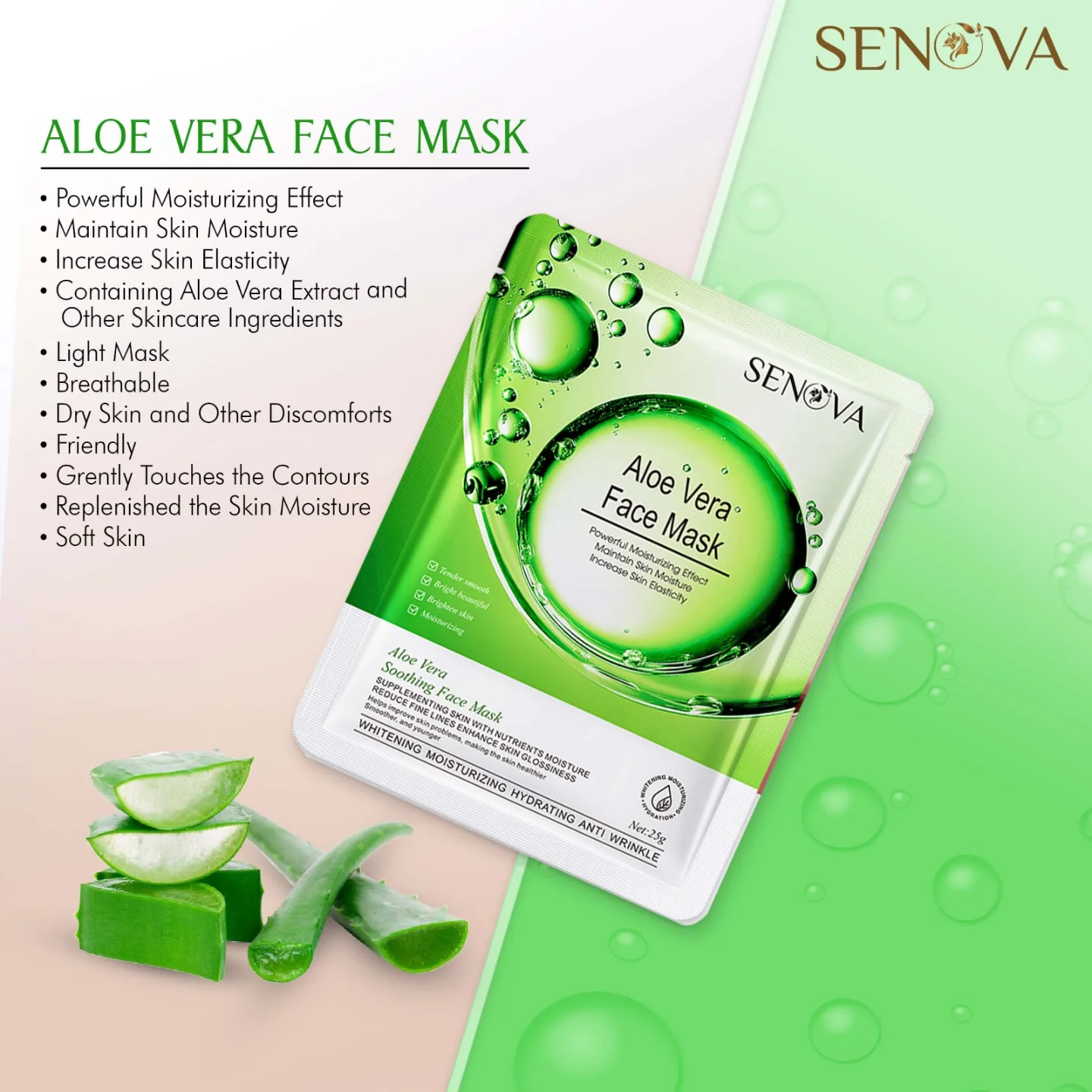 Senova Aloe Vera Face Mask provides deep hydration while soothing and replenishing the skin. Infused with powerful moisturizing ingredients, it helps maintain moisture balance, improve skin elasticity, and refresh the skin for a soft, radiant glow.