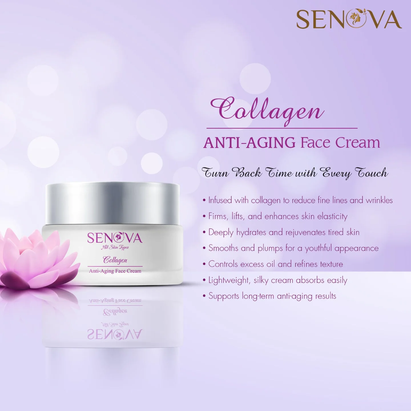 Senova Collagen Anti-Aging Face Cream replenishes collagen lost by the skin, increases elasticity, and deeply moisturizes. Enriched with essential skincare ingredients, it helps to smooth wrinkles, firm the skin, and restore a youthful glow.