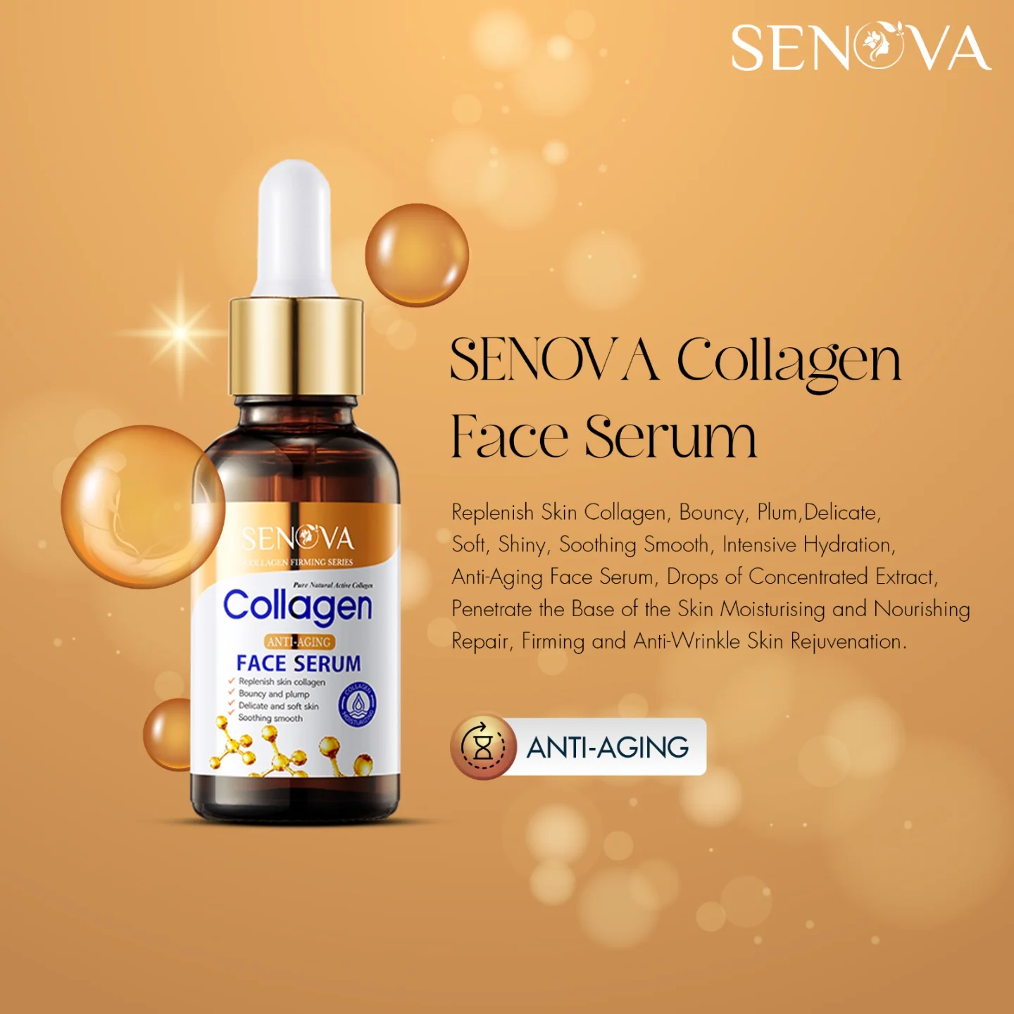 SENOVA Collagen Anti-Aging Face Serum replenishes skin collagen, giving a bouncy, plump, and youthful appearance. Its active protein technology enhances skin elasticity and delivers a soothing, smooth texture for delicate, soft skin.