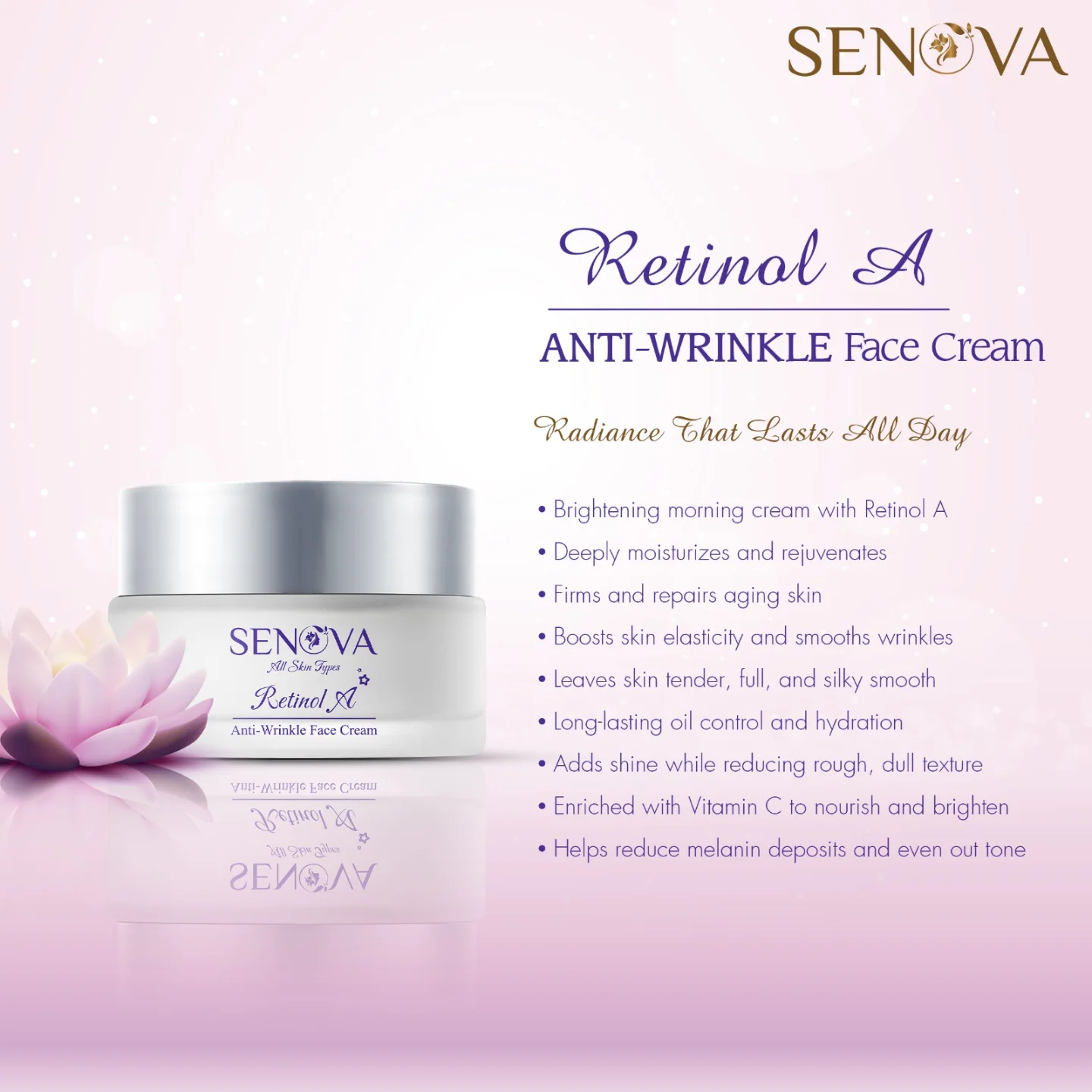 SENOVA Retinol A Anti-Wrinkle Face Cream is a luxurious anti-aging solution enriched with Retinol, Hyaluronic Acid, Vitamin E, and natural extracts. It moisturizes, rejuvenates, and smoothens the skin, leaving it youthful and radiant.