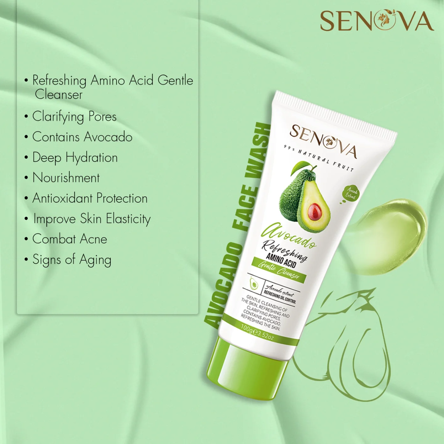 Senova Avocado Refreshing Amino Acid Gentle Cleanser creates a rich, delicate foam that gently removes excess oil, dirt, and daily makeup residue. Infused with avocado extract, it refreshes the skin, unclogs pores, and leaves the skin feeling clean, hydrated, and balanced.