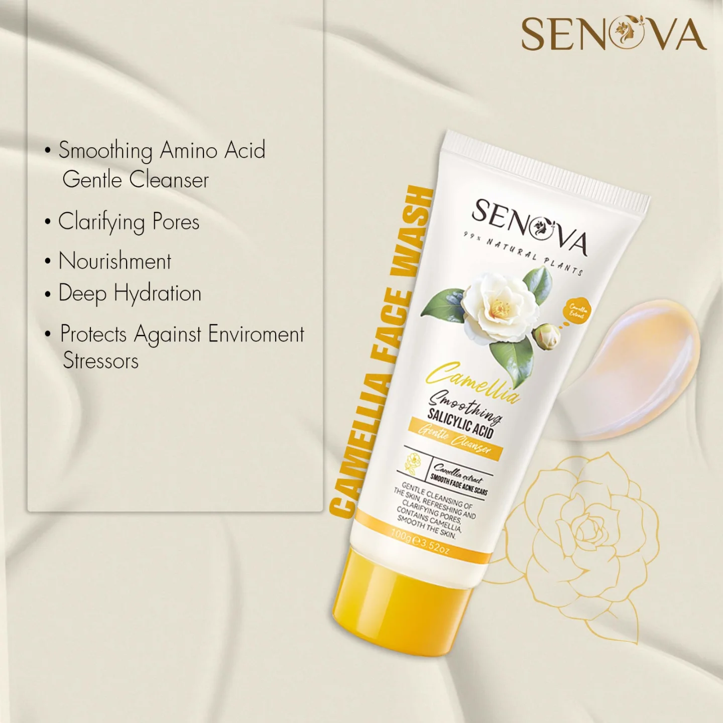 Senova Camellia Smoothing Salicylic Acid Gentle Cleanser is a delicate foaming cleanser that effectively removes dirt, excess oil, and makeup residue. Infused with camellia extract and salicylic acid, it helps to smooth skin texture, clear pores, and provide a refreshing and comfortable cleansing experience.