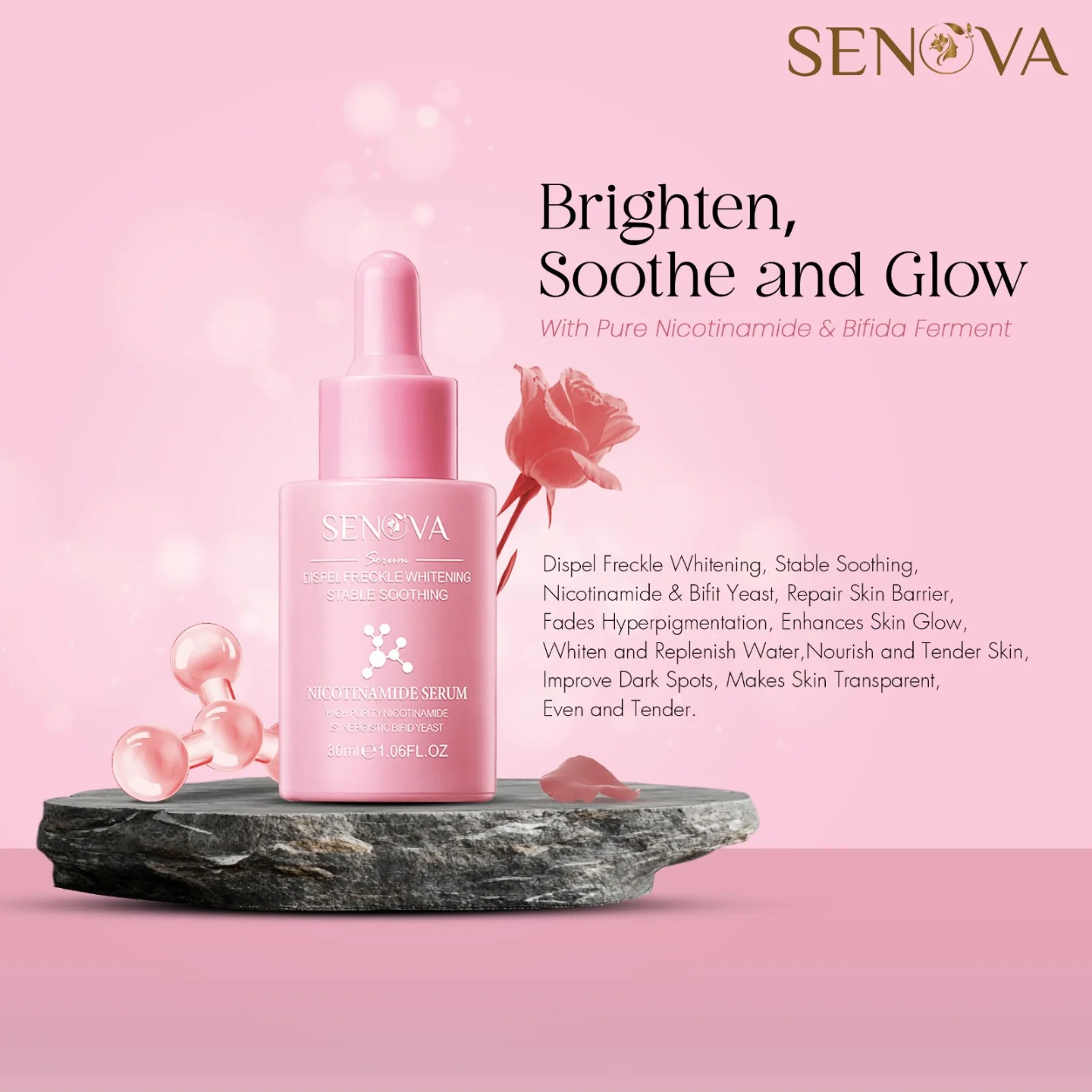Senova Nicotinamide Serum is a lightweight, fast-absorbing formula designed to brighten the skin, reduce hyperpigmentation, and strengthen the skin barrier. Infused with Nicotinamide & Bifid Yeast, it helps to fade freckles, soothe irritation, and promote a radiant, even complexion. The serum works deeply to replenish moisture and improve overall skin texture for a healthy, luminous glow.