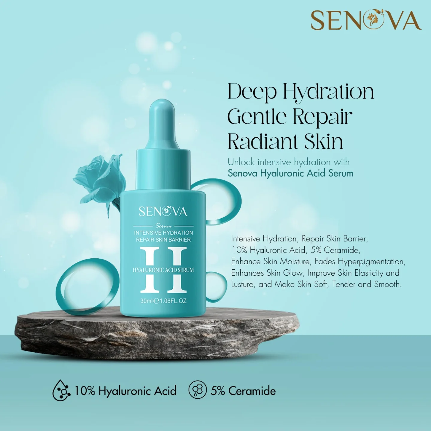 Senova Hyaluronic Acid Serum is a deeply hydrating formula designed to enhance moisture retention, repair the skin barrier, and fade hyperpigmentation. Infused with 10% Hyaluronic Acid and 5% Ceramide, it helps improve skin elasticity, leaving it plump, smooth, and radiant. The lightweight texture absorbs effortlessly, delivering long-lasting hydration and a refreshing feel.