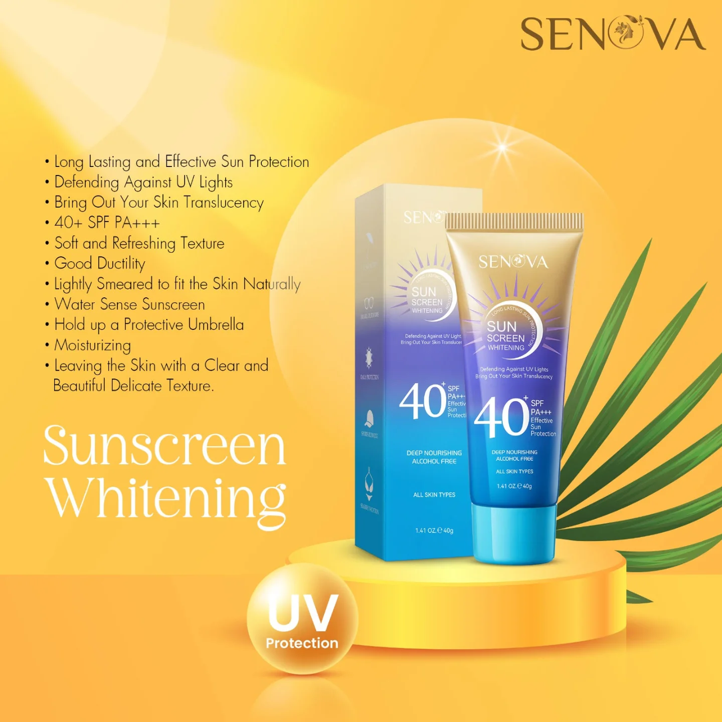 Senova Whitening Sunscreen provides effective sun protection while deeply nourishing the skin. Its advanced formula helps shield against harmful UV rays, prevent sun-induced skin damage, and maintain hydration for a smooth, radiant look.
