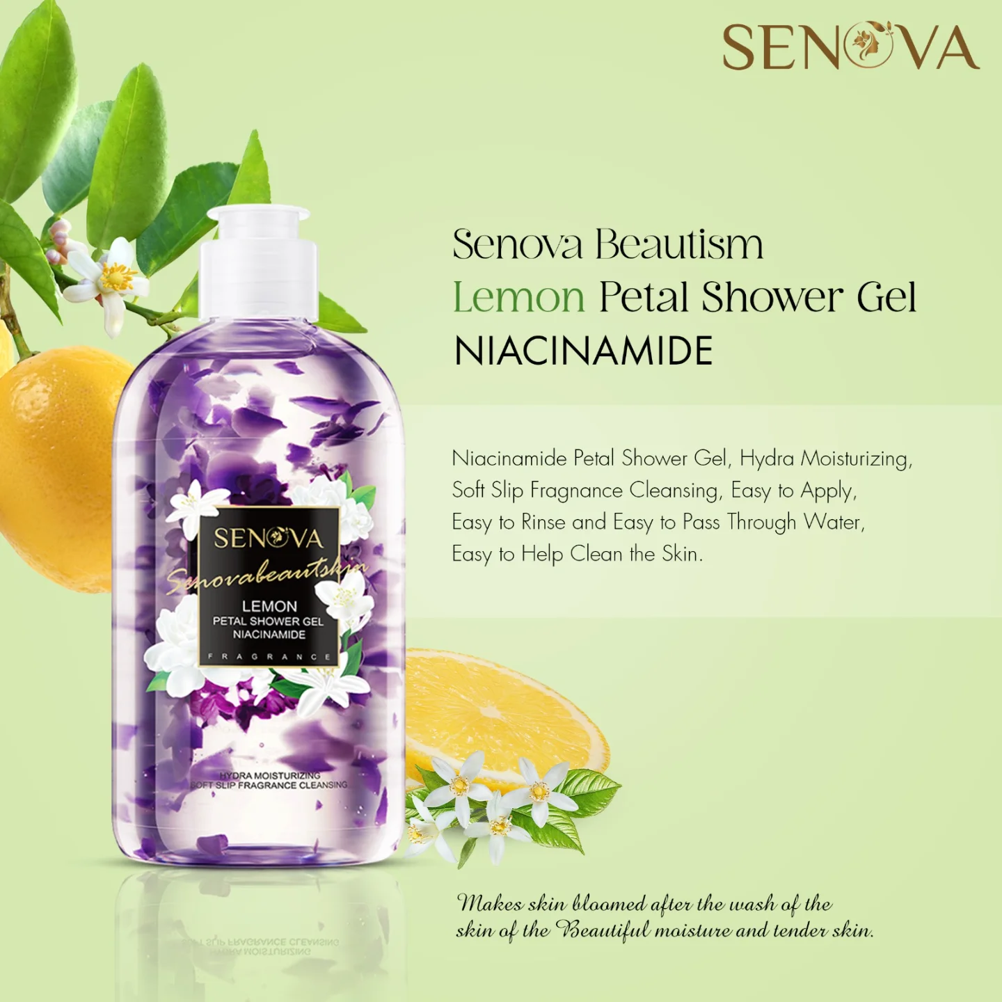 SENOVA Lemon Niacinamide Petal Shower Gel is a luxurious cleansing experience, enriched with real flower petals and niacinamide. It hydrates, moisturizes, and leaves your skin feeling refreshed with a lemon fragrance.