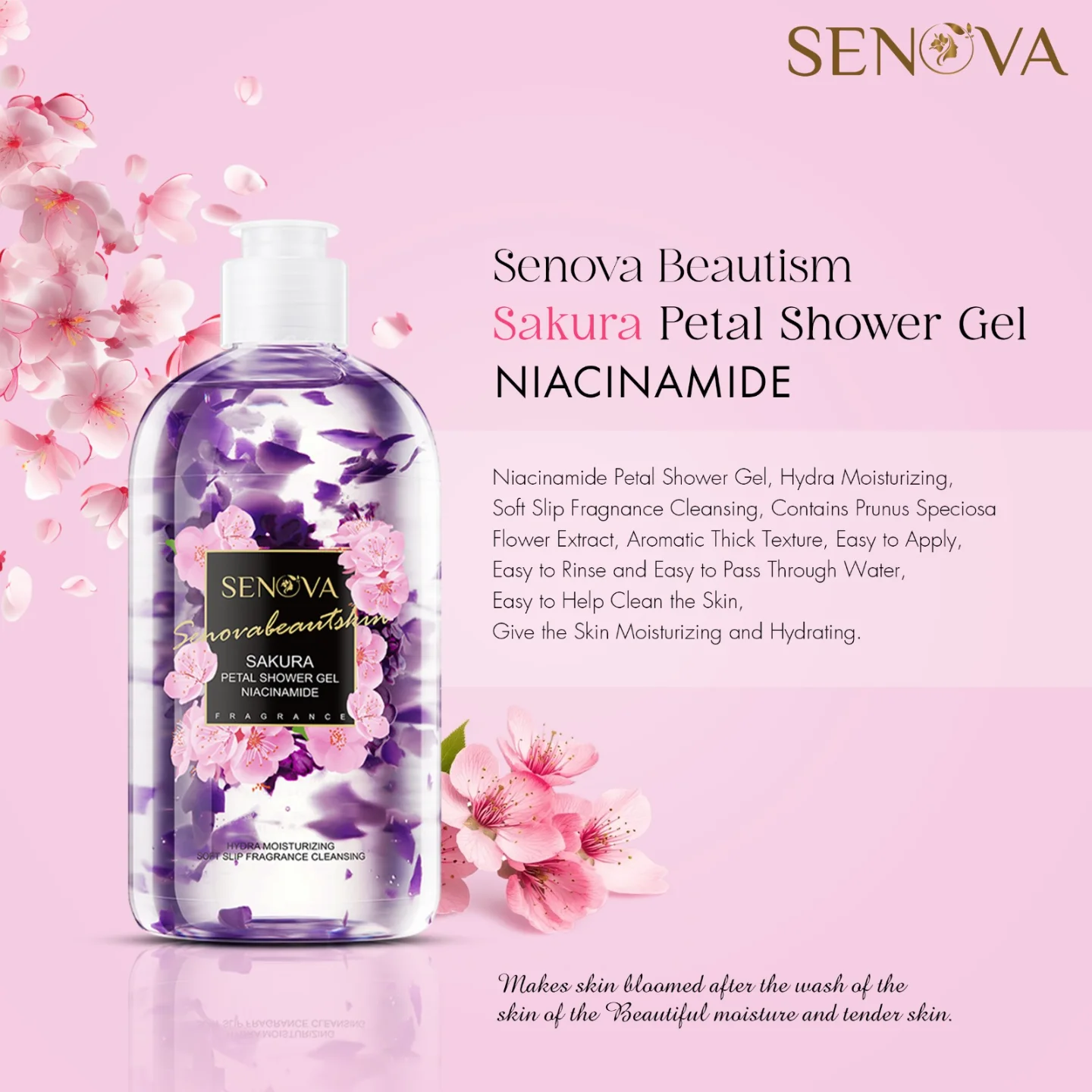 Senova Sakura Petal Shower Gel offers a luxurious cleansing experience infused with the delicate fragrance of blooming cherry blossoms. The nourishing formula deeply cleanses while maintaining skin hydration, leaving your skin refreshed, soft, and beautifully scented. With visible sakura petals suspended in the gel, it provides a visually elegant touch that enhances your shower routine, promoting relaxation and a sense of indulgence.