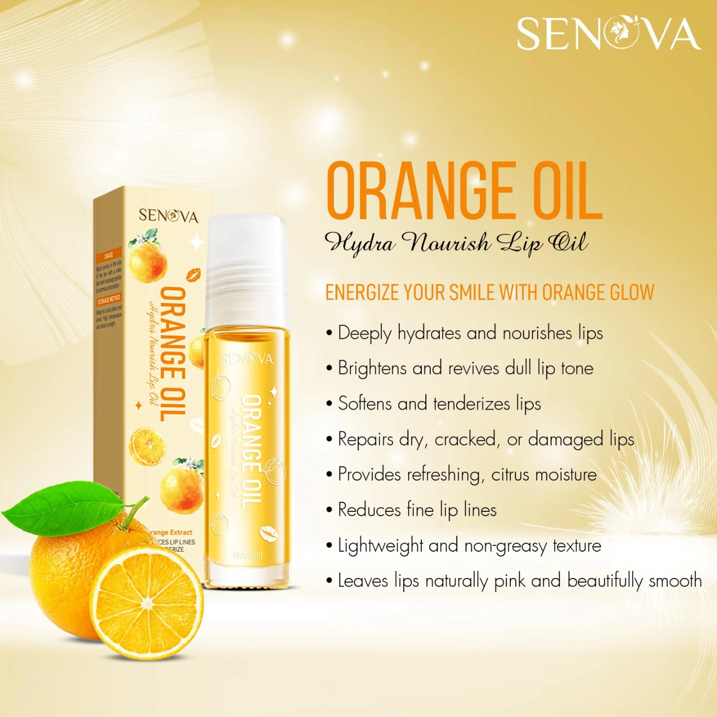 botanical oils, it helps reduce lip lines, smooth texture, and prevent dryness, leaving lips soft, Senova Orange Oil Hydra Nourish Lip Oil is a lightweight and deeply moisturizing formula designed to nourish and protect the lips. Enriched with orange extract and plump, and naturally radiant. The silky, non-sticky consistency ensures effortless application while delivering lasting hydration with a refreshing citrus scent.