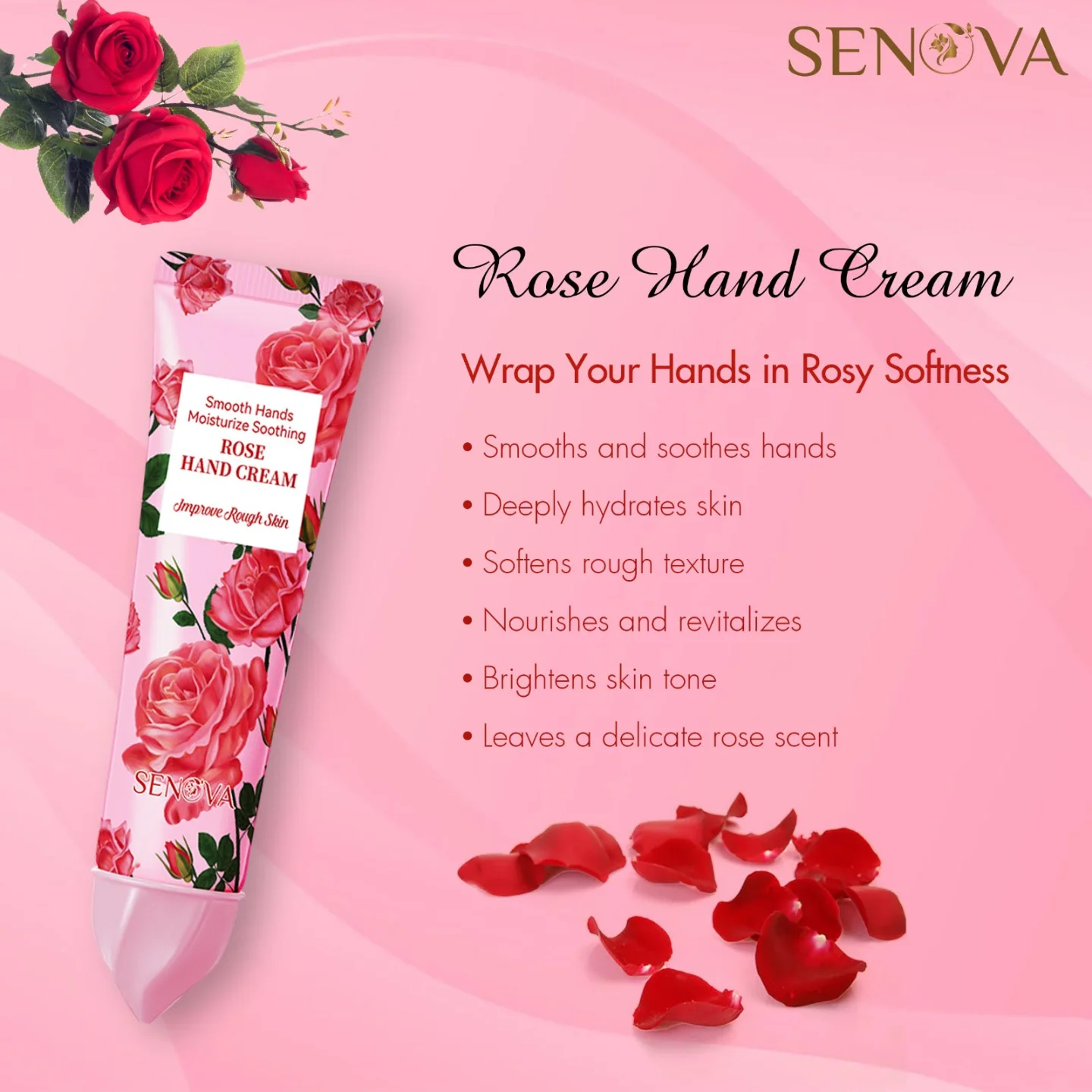 Senova Rose Hand Cream is a deeply hydrating and soothing formula designed to nourish and protect dry, rough hands. Infused with Rosa Rugosa Flower Extract, it helps improve skin texture, restore softness, and enhance moisture retention, leaving hands feeling smooth, supple, and delicately scented. The lightweight formula absorbs quickly without a greasy residue, making it perfect for daily use.