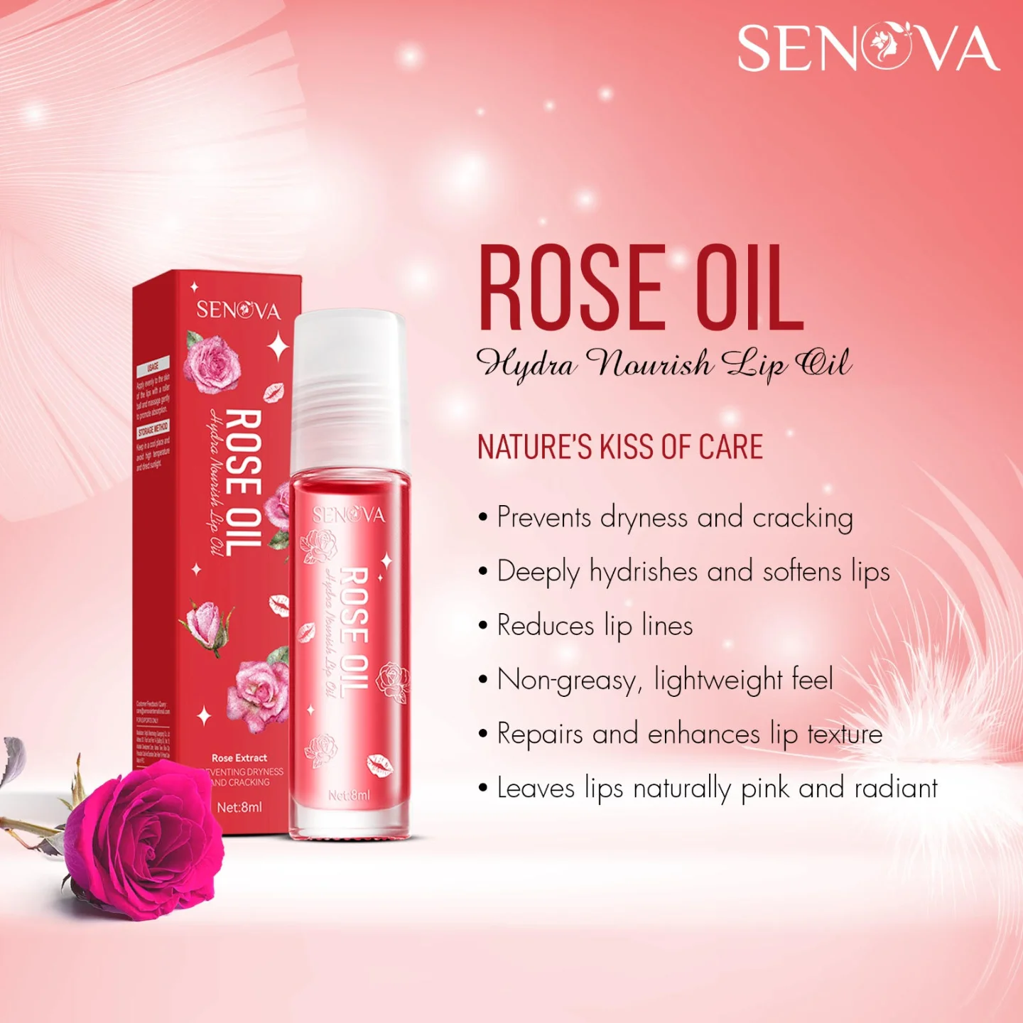 Senova Rose Oil Hydra Nourish Lip Oil is a lightweight yet deeply moisturizing formula designed to nourish and repair dry, chapped lips. Infused with Rosa Rugosa Flower Extract and botanical oils, it helps prevent dryness, reduce lip lines, and enhance softness, leaving lips looking plump and naturally radiant. The non-greasy texture ensures smooth application while providing lasting hydration and a subtle, refreshing finish.