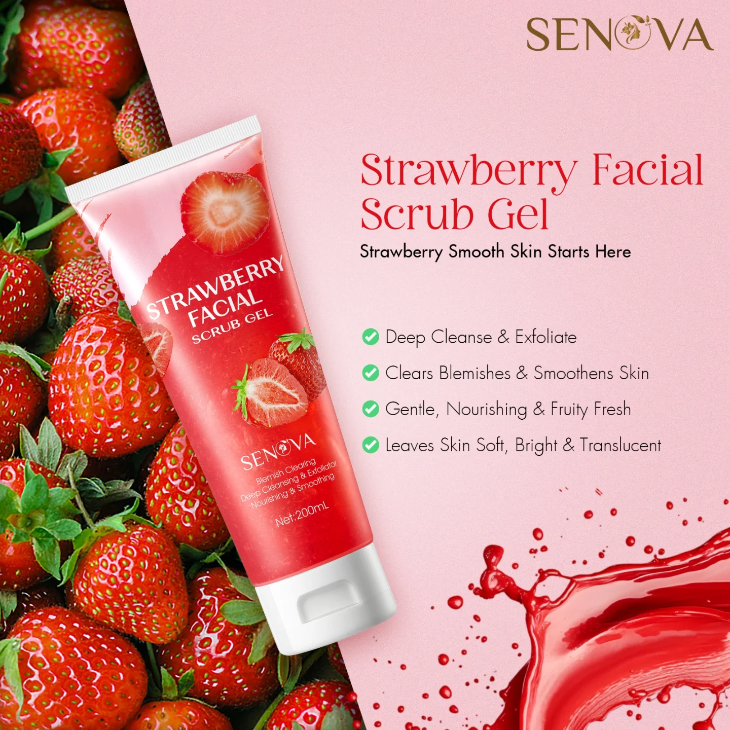 Senova Strawberry Facial Scrub Gel is a gentle exfoliator that deeply cleanses, removes impurities, and smooths the skin. Infused with natural exfoliating agents and nourishing ingredients, it leaves your skin refreshed, soft, and radiant.