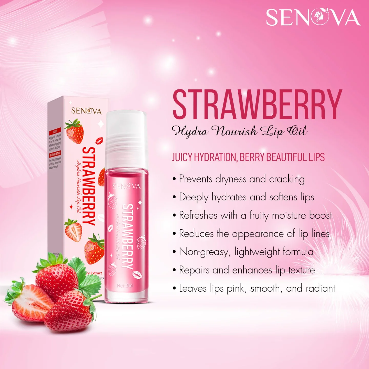 Senova Strawberry Hydra Nourish Lip Oil is a lightweight, non-greasy formula designed to deeply nourish and repair dry lips. Infused with strawberry extract and botanical oils, it helps reduce lip lines, prevent cracking, and restore natural softness, leaving lips looking plump, healthy, and beautifully conditioned. The smooth, hydrating texture absorbs easily while providing lasting moisture and a refreshing finish.