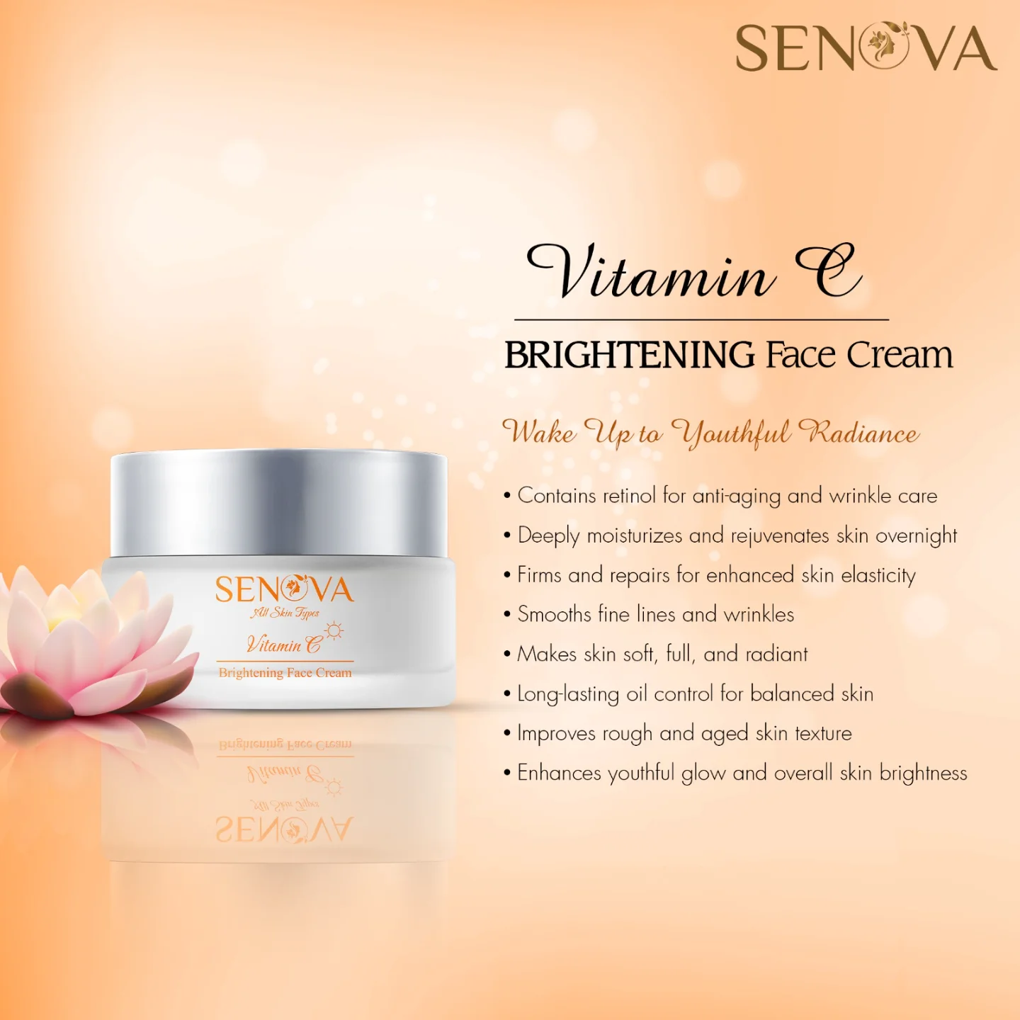 Senova Vitamin C Brightening Face Cream is designed to deeply nourish and hydrate the skin while promoting an even, radiant complexion. With a blend of powerful ingredients, it helps improve skin texture, reduce dullness, and enhance overall skin brightness.