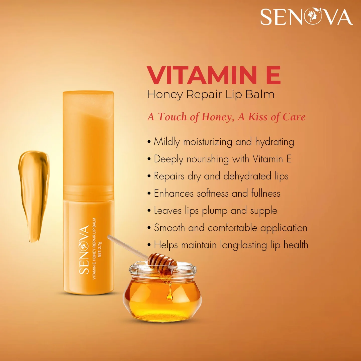 Senova Vitamin E Honey Repair Lip Balm provides deep nourishment and moisture care to relieve dryness and dehydration while restoring softness and plumpness. Infused with honey extract and vitamin E, this gentle formula hydrates, smooths, and enhances lip texture, leaving a natural, healthy glow. Its lightweight consistency ensures effortless application, giving lips a revitalized, baby-soft feel.